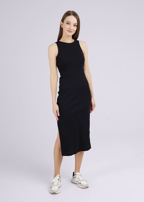 Платье прилегающего силуэта длины миди, без рукавов, горловина и пройма обработаны обтачками