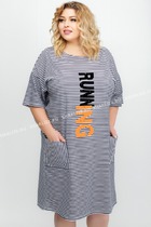 Платье для дома и отдыха из хлопкового трикотажного полотна,прямого силуэта. Втачной короткий рукав, внизу термонаклейка силикон. Округлая горловина с обтачкой. По низу изделия отрезная юбка, собрана на сборку. Спереди принт,вышивка.