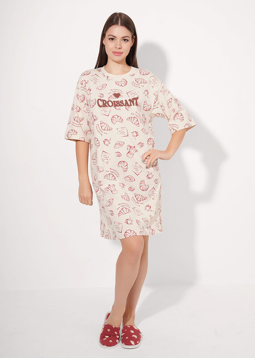 Платье для дома и отдыха прямого силуэта из хлопкового трикотажного полотна. Округлая горловина с обтачкой. Втачной короткий рукав. Спереди принт. Боковые карманы в швах. По бокам разрезы.