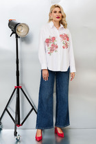 Блузка прямого силуэта из трикотажного полотна, с отложным воротником на стойке. Спереди цельнокроеная планка с застежкой на пуговицы. Длинный втачной рукав, внизу с притачной манжетой и застежкой на пуговицу. По спинке кокетка со складкой.