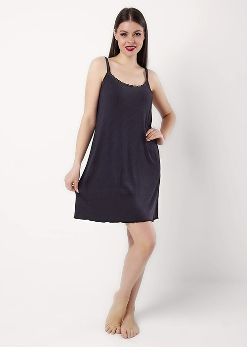 Ночная сорочка для дома и отдыха из вискозного трикотажного полотна кашкорсе лапша. А-образного силуэта длиной чуть ниже колена, на узких бретелях. Спереди по горловине кружево, по спинке обтачка. По низу изделия узкий оверлок.