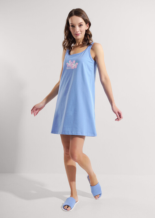 Ночная сорочка из хлопкового трикотажного полотна с добавлением эластана. А-образного силуэта на бретелях. Округлая горловина, по горловине и пройме окантовка. Спереди принт.