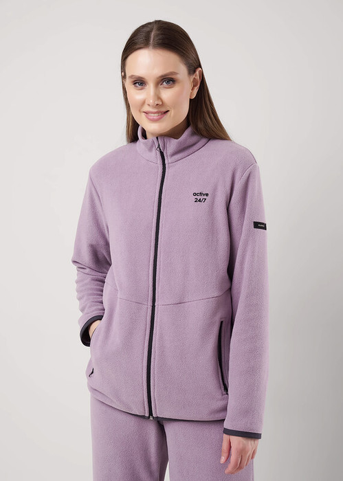 Куртка спортивная прямого силуэта из трикотажного полотна флис, на молнии. По горловине стойка. Спереди горизонтальный рез, карманы на молнии. Длинный рукав со спущенной линией плеча, нашивка.По низу рукава и низа изделия окантовка. Спереди вышивка.