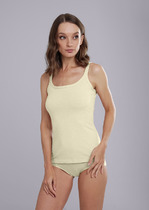 Майка-борцовка из хлопкового трикотажного полотна с эластаном, широкая бретель. Лиф переда двойной. Бретель, горловина и проймы обработаны окантовкой. По низу изделия отрезной пояс с внутренней резинкой. На поясе по центру принт.