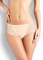 Бикини из комбинированного полотна: деталь переда - однотонный хлопок, спинка - сетка. По ножкам и талии обработаны резинкой с фестоном. Спереди по центру расположен небольшой атласный бант.