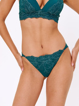 Комбинированные бикини комфортной посадки: верхняя часть состоит из кружева, нижняя- из трикотажа. По ножкам и поясу обработка резинкой. Спереди расположены небольшие атласный банты.