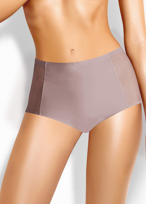 Трусы-макси женские из полиамида с эластаном. По переду вставки из сетки. Обработка краев - подклееный край. Хлопковая ластовица.