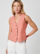 Вязаный жилет прямого силуэта из акриловой пряжи ажурного переплетения. V-образный вырез горловины. По борту имитация застежки, бейка без пуговиц. По горловине, пройме и низу изделия бейка.