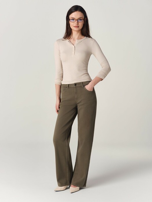 Джинсы straight wide выполнены в природном тёмно-оливковом оттенке – эта гамма придаёт винтажную эстетику, добавляя образам выразительность и характер. Особенность модели – её фактурное саржевое плетение, которое придаёт ткани визуальный объём и фактуру. Благодаря широкому прямому крою модель не сковывает движения и вытягивает силуэт.