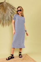 Платье из футера со спущенной линией плеч и разрезом станет основой для множества расслабленных базовых образов, а также может быть стилизовано для умеренно деловых и вечерних аутфитов.