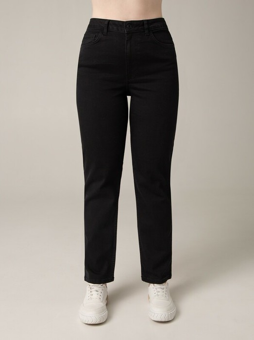 Джинсы с высокой посадкой из плотного, но эластичного денима красиво и комфортно садятся по фигуре, не добавляя силуэту ненужный объем.