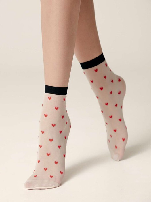 Тонкие фантазийные носки с рисунком «сердечки», выполненном из красной полипропиленовой нити – идеальное дополнение к романтичному образу современной девушки. Носки эластичные, легкие, безупречно облегающие ногу, поэтому в них будет комфортно на протяжении всего дня.