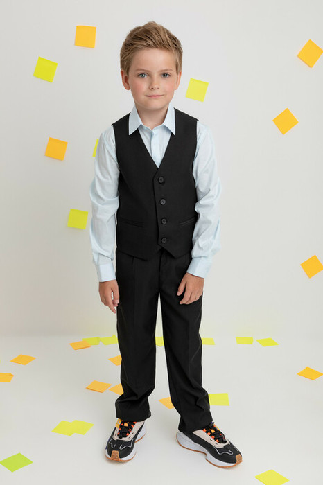 Классические школьные брюки со стрелками для мальчика. Застёгиваются на пуговицу, регулируются по ширине с помощью утяжки на резинку и пуговицы. По бокам и на спинке удобные карманы. По низу брюки обработаны оверлоком.