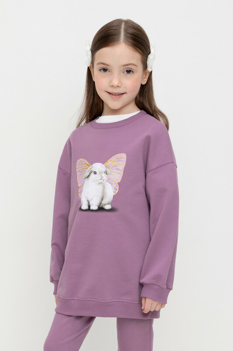 Удлиненный свитшот для девочки из высококачественного футера трехнитки. Обтачка горловины, манжеты и пояс выполнены из эластичного полотна. Оригинальный принт выполнен из стойких текстильных красителей.