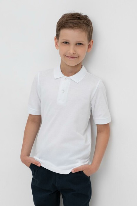 Поло для мальчика из высококачественного трикотажного полотна пике. У изделия вязаный воротник, манжеты и застежка спереди на пуговицы.