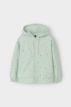 Трикотажная толстовка на молнии с капюшоном для девочки из мягкого набивного футера петли. Модель с боковыми карманами и манжетами на резинке.
