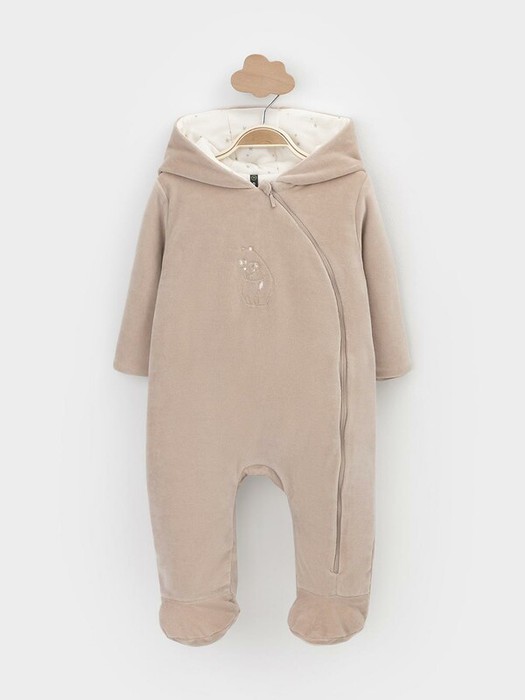Тёплый комбинезон из велюра для новорождённых. Внутри синтепон и подклад из натурального хлопка. Изделие застёгивается на молнию и имеет капюшон. В размерах 80 и 86 на ножках манжеты. Все трикотажные полотна производятся в соответствии с нормами Швейцарского сертификата ЭкоТекс.