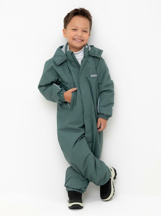 Демисезонный комбинезон для мальчика с утеплителем SEE®: 120 г/м2. Выполнен из мембранной ткани с дополнительной тефлоновой обработкой. Данный вид обработки предохраняет изделие от загрязнения и лучше отводит влагу. Подклад из 100% полиэстра. У изделия удлиненная молния для легкого одевания с защитой подбородка. Несъемный капюшон имеет эластичную резинку для лучшего прилегания. По низу рукавов и брючин эластичные манжеты. Функциональный карман с молнией на груди. Для фиксации комбинезона используются съемные силиконовые штрипки. Во всех изделиях верхнего ассортимента для безопасности ребенка предусмотрены светоотражающие элементы.