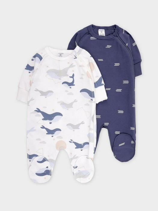 Комбинезоны для новорождённых из мягкого эластичного трикотажа интерлок, произведённого из натурального хлопка. В упаковке 2 штуки. Застёгиваются сбоку на молнию и на кнопку. Длинные рукава-реглан оканчиваются манжетами. Оригинальная набивка выполнена из стойких гипоаллергенных текстильных красителей. Все трикотажные полотна производятся в соответствии с нормами Швейцарского сертификата ЭкоТекс.
