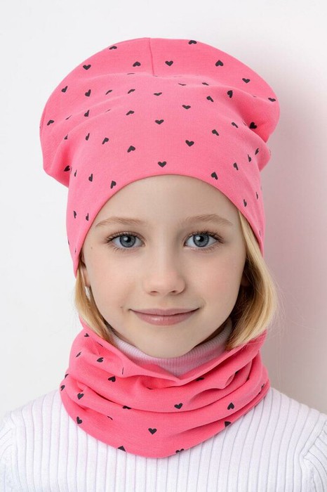Комплект для девочки - шапка и снуд из трикотажа рибана с эластаном. Шапка с удлинённой скругленной макушкой. Снуд сплошной. Украшены набивным рисунком с изображением сердечек и жаккардовыми нашивками.