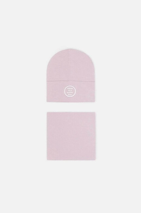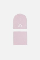 Комплект для девочки: шапка и снуд из хлопкового трикотажа в рубчик с добавлением эластана, окрашенного стойкими гипоаллергенными текстильными красителями. Изделия хорошо тянутся, после многократных стирок сохраняют цвет и форму.
