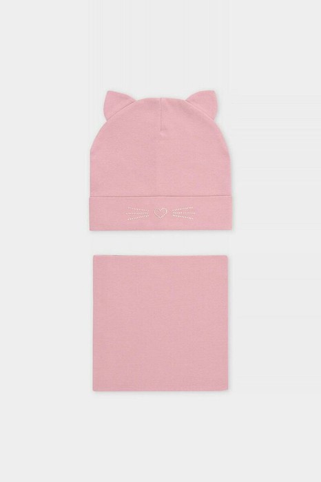 Комплект для девочки: шапка и снуд из хлопкового трикотажа с добавлением эластана, окрашенного стойкими гипоаллергенными текстильными красителями. Изделия хорошо тянутся, после многократных стирок сохраняют цвет и форму.