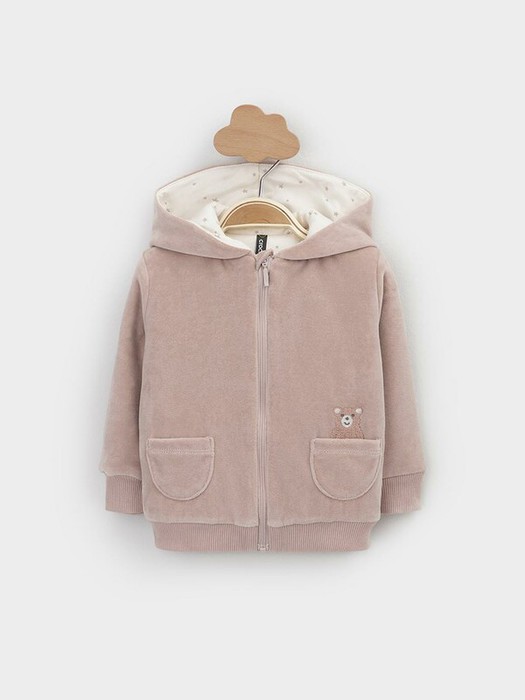 Тёплая куртка из велюра для новорождённых. Внутри синтепон и подклад из натурального хлопка. Изделие застёгивается на молнию и имеет капюшон. На рукавах мягкие манжеты, внизу - эластичный пояс. Спереди два накладных кармана и украшение в виде вышивки. Все трикотажные полотна производятся в соответствии с нормами Швейцарского сертификата ЭкоТекс.