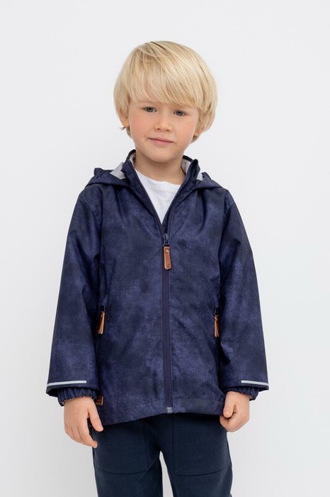 Ветровка для мальчика из мембранной ткани с дополнительной тефлоновой обработкой.  Верхняя мембранная ткань 1000/1000 с тефлоновым покрытием отталкивает воду и грязь и обладает «дышащими» свойствами. Подкладка выполнена из 100% полиэстера. У изделия предусмотрена защита подбородка. Несъемный капюшон регулируется с помощью эластичного шнура со стопперами. Низ рукавов имеет эластичную резинку для лучшего прилегания. Во всех изделиях верхнего ассортимента для безопасности ребенка предусмотрены светоотражающие элементы