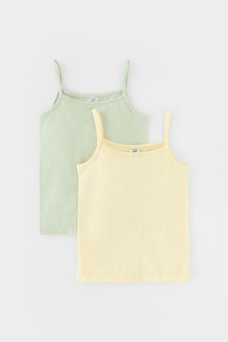 Трикотажные майки в комплекте 2 шт на тонких бретелях из однотонного супрема с эластаном, горловина спинки и проймы обработаны кантом, по горловине полочки декоративная эластичная тесьма и атласный бантик. Сохраняют цвет и форму после многократных стирок. Все трикотажные полотна производятся в соответсвии с нормами Швейцарского сертификата ЭкоТекс.