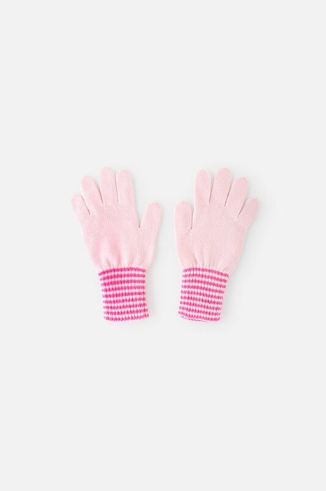 Вязаные перчатки из акриловой пряжи персикового цвета с мягкими полосатыми манжетами. Широкие манжеты крепко фиксируют перчатку на руке.