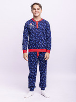Трикотажная пижама из натурального хлопка. Джемпер с длинными втачными рукавами и брюки с эластичной резинкой в поясе. Мягкие манжеты на рукавах и по низу брюк. Оригинальная набивка выполнена из стойких текстильных гипоаллергенных красителей. Изделие сохраняет цвет и форму после многократных стирок. Все трикотажные полотна производятся в соответсвии с нормами швейцарского сертификата ЭкоТекс.