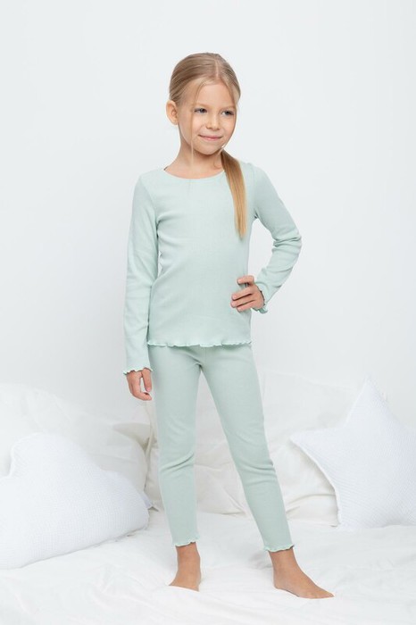 Трикотажная пижама в рубчик из натурального хлопка . Джемпер с длинными втачными рукавами. У лосин мягкий, эластичный пояс на резинке. Комплект сохраняет цвет и форму после многократных стирок. Все трикотажные полотна производятся в соответсвии с нормами Швейцарского сертификата ЭкоТекс.