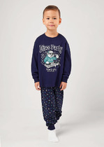 Трикотажный пижамный комплект из футера с начёсом, произведённого из натурального хлопка. У джемпера длинные рукава со спущенными плечами и эластичная мягкая горловина и манжеты. Брюки с удобным поясом на резинке, внизу манжеты. Оригинальная набивка  выполнена из стойких, гипоаллергенных текстильных красителей. Все трикотажные полотна производятся в соответствии с нормами Швейцарского сертификата ЭкоТекс.