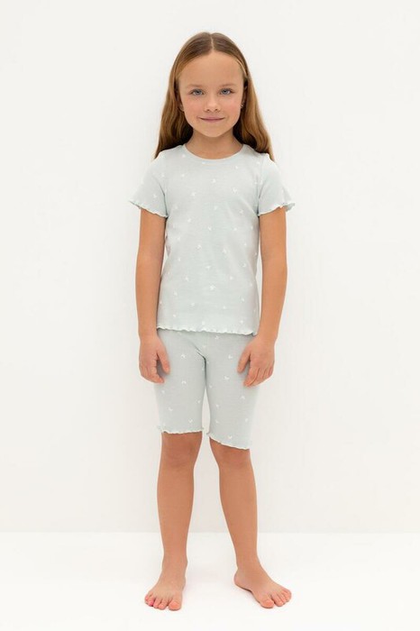 Трикотажная пижама в рубчик из натурального хлопка. Футболка с короткими втачными рукавами и шорты с эластичной резинкой в поясе. Оригинальная набивка выполнена из стойких текстильных гипоаллергенных красителей. Изделие сохраняет цвет и форму после многократных стирок. Все трикотажные полотна производятся в соответсвии с нормами швейцарского сертификата ЭкоТекс.