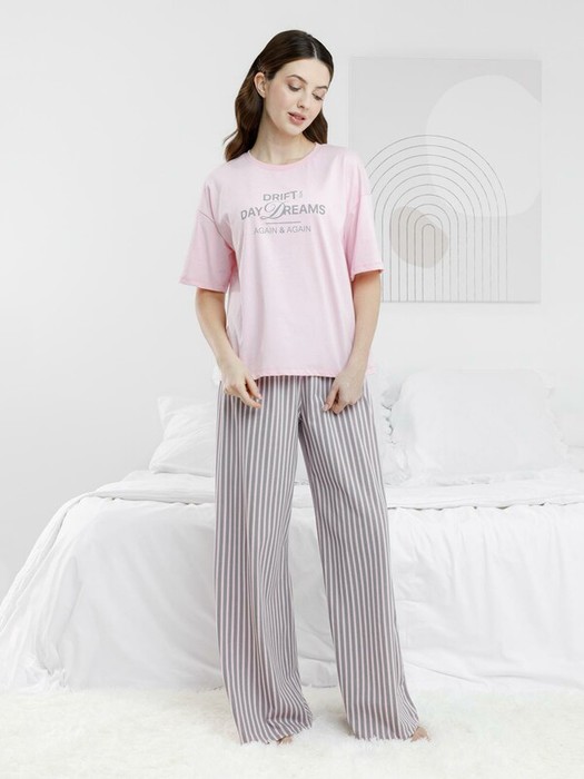 Трикотажная пижама из натурального хлопка для комфортного сна и отдыха. Свободная футболка с короткими спущенными рукавами и широкие брюки с мягкой эластичной резинкой в поясе. Гладкий материал приятен к телу, не теряет форму и позволяет коже дышать. Оригинальный принт и набивка выполнены из стойких текстильных гипоаллергенных красителей. Все трикотажные полотна производятся в соответствии с нормами швейцарского сертификата ЭкоТекс.