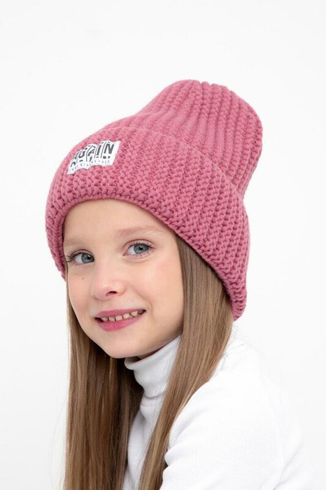 Тёплая вязаная шапка в оттенке "брусника" для девочки. На отвороте прикреплена нашивка с надписью.