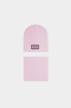 Двойная розовая шапка из полушерсти. Украшена нашивкой с изображением котика.