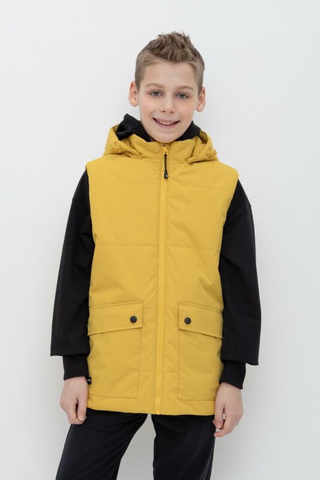 Стеганный жилет с капюшоном для мальчика с утеплителем Fellex®: 120 г/м2. Выполнен из мембранной ткани с дополнительной тефлоновой обработкой и матовым покрытием. Данный вид обработки предохраняет изделие от загрязнения и лучше отводит влагу. Подклад из 100% полиэстра. У изделия предусмотрена защита подбородка. Накладные карманы с клапанами на кнопках. Во всех изделиях верхнего ассортимента для безопасности ребенка предусмотрены светоотражающие элементы.