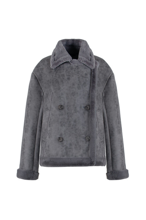 Дубленка женская прямого силуэта, двубортная, длиной до середины бедра. На переде карманы с настрочной листочкой, застежка на петли и пуговицы. Рукава длинные, двухшовные. Воротник и лацкана отложные. Правый лацкан можно застегивать на кнопку.