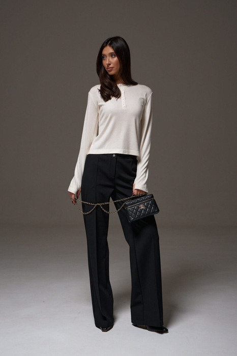 Джемпер выполнен из трикотажного полотна молочного цвета. Характеристики: прмой силуэт, овальная горловина. В области горловины застежка на петли пуговички. Рукав втачной, длина 63 см. На внутренней стороне рукава, на месте шва есть разрез для большого пальца. Длина по спинке 52 см.