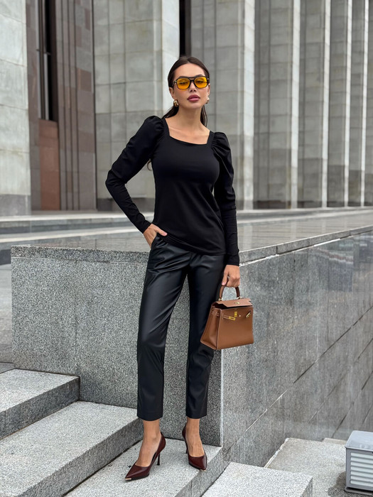 Джемпер трикотажный, прямого силуэта. Лиф обработан вырезом каре, рукав втачной,  прямой, по верху присборен