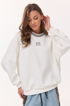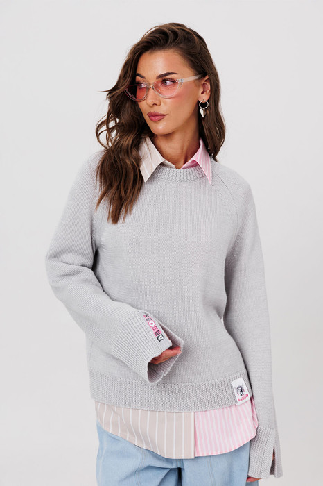 Джемпер трикотажный вязанный с длинным рукавом-реглан, по низу рукава планка с разрезом. На правом рукаве нашивка «ЛЮБОВЬ». По перу нашивка «BUTER».  По горловине притачная планка из основного трикотажа, вырез горловины круглый.