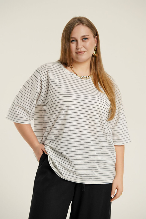 Джемпер свободного покроя из тонкого трикотажного полотна. Вырез горловины- неглубокий, округлой формы с отрезной планкой. Рукава- со спущенной линией плеча.