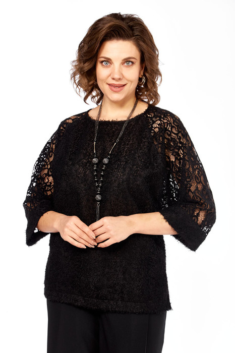 Праздничная элегантная блузка полуприлегающего силуэта, выглядит эффектно, прекрасно подойдет для вечерних мероприятий. Горловина аккуратной округлой формы. Рукав выполнен из мягкого кружева, что придает дополнительный шарм, длина 7/8. В боковых швах предусмотрены разрезы.