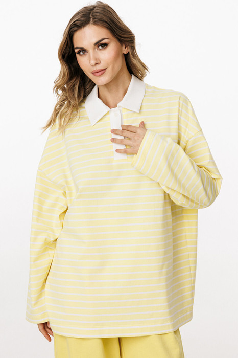 Джемпер выполнен из трикотажного полотна в полоску. Джемпер прямого силуэта, покроя oversize. Длиной до линии бедер. По переду обработана застежка на планке от горловины до линии груди. Горловина округлой формы, обработана воротником рубашечной формы. Плечевой шов удлинен. Рукав рубашечного покроя, одношовный. Планки и воротник выполнены из однотонного трикотажного полотна.