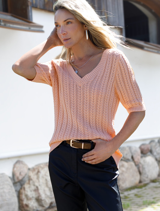 Состав: 70%Хлопок 21%ПА 9%Кашемир Размер товара на первом фото: 42Джемпер фактурной вязки выполнен из хлопка с добавлением кашемира. Модель с V-вырезом с вывязанным орнаментом цепи. Мягкая и очень приятная пряжа совершенно не колется, сохраняет тепло при этом не перегревая, гарантируя безупречный комфорт.