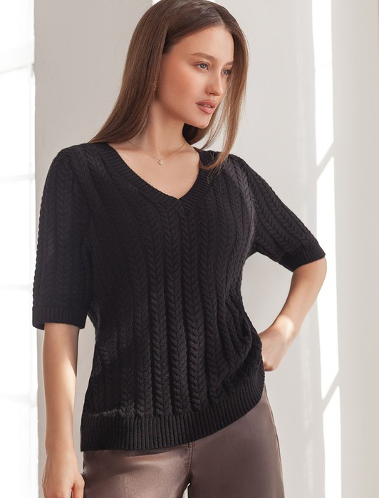 Состав: 70%Хлопок 21%ПА 9%Кашемир Размер товара на первом фото: 42Джемпер фактурной вязки выполнен из хлопка с добавлением кашемира. Модель с V-вырезом с вывязанным орнаментом цепи. Мягкая и очень приятная пряжа совершенно не колется, сохраняет тепло при этом не перегревая, гарантируя безупречный комфорт.