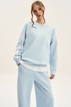 "Джемпер свободного силуэта, рубашечного покроя с горловиной, отделочной тесьмой-довязом. Полочка с вертикальным делением и сложным соединением полоски под различными углами. Рукав расширенный в области оката. Длина джемпер около 67см.