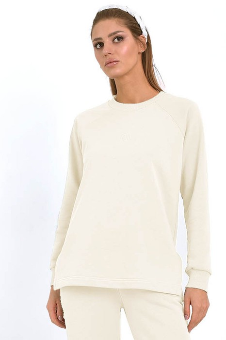Нежный женский удлиненный свитшот, пошит из комфортной, всесезонной ткани. Свитшот имеет слегка расширенный к низу силуэт и разрезы в боковых швах. Бейка горловины, манжеты рукавов изготовлены из ткани-компаньена кошкорсе. Свитшот имеет рукава покроя реглан. По центру переда вышит логотип в цвет ткани.