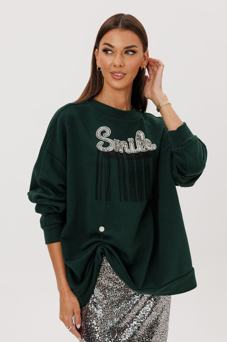 Блузон-бомбер прямого свободного силуэта oversize со спущенной линией плеча. Рукав трехшовный, оканчивается манжетой, шириной 5,5 см. По центру линии плеча, рукава, вставлены лампасы из основного трикотажного полотна шириной 4 см. Горловина имеет округлый вырез, обработана планкой по косой шириной 3 см. Низ изделия обработан планкой-манжетой высотой 6,5 см. На фронтальной части переда расположен декоративный элемент: тесьма вытянутой прямоугольной формы и эффектная термоаппликация со стразами и нитями бисера. Длина изделия свитшота по центральной линии спинки 70-72 см (в зависимости от размерного ряда).